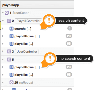 Many beginner Angular tutorials start with a set of canned data, an input field, and a search filter, so it was a natural place to start on my side project, Virtual Playbill. With even a small data set, watching the DOM change based on search criteria was a thrilling achievement. In the intervening months, as features were added, rebuilt, or taken away, I had inadvertently broken the search box. The tutorials were still available, and still fairly basic, but I couldn’t get it to work. Not until I found a couple of invaluable tools for troubleshooting overlapping scopes: