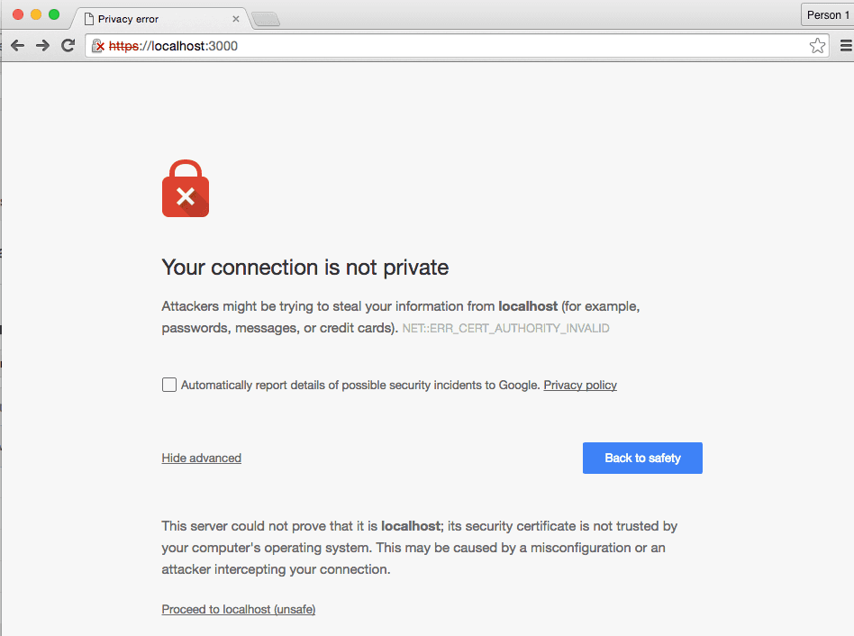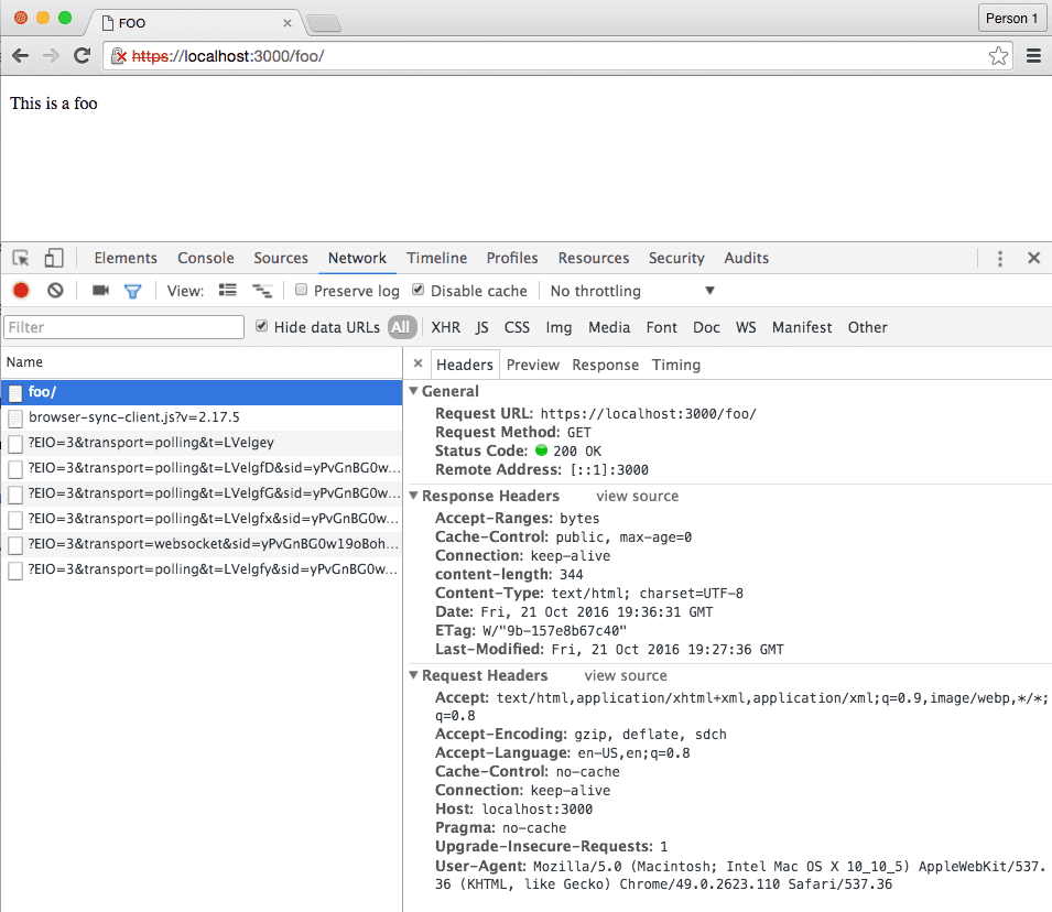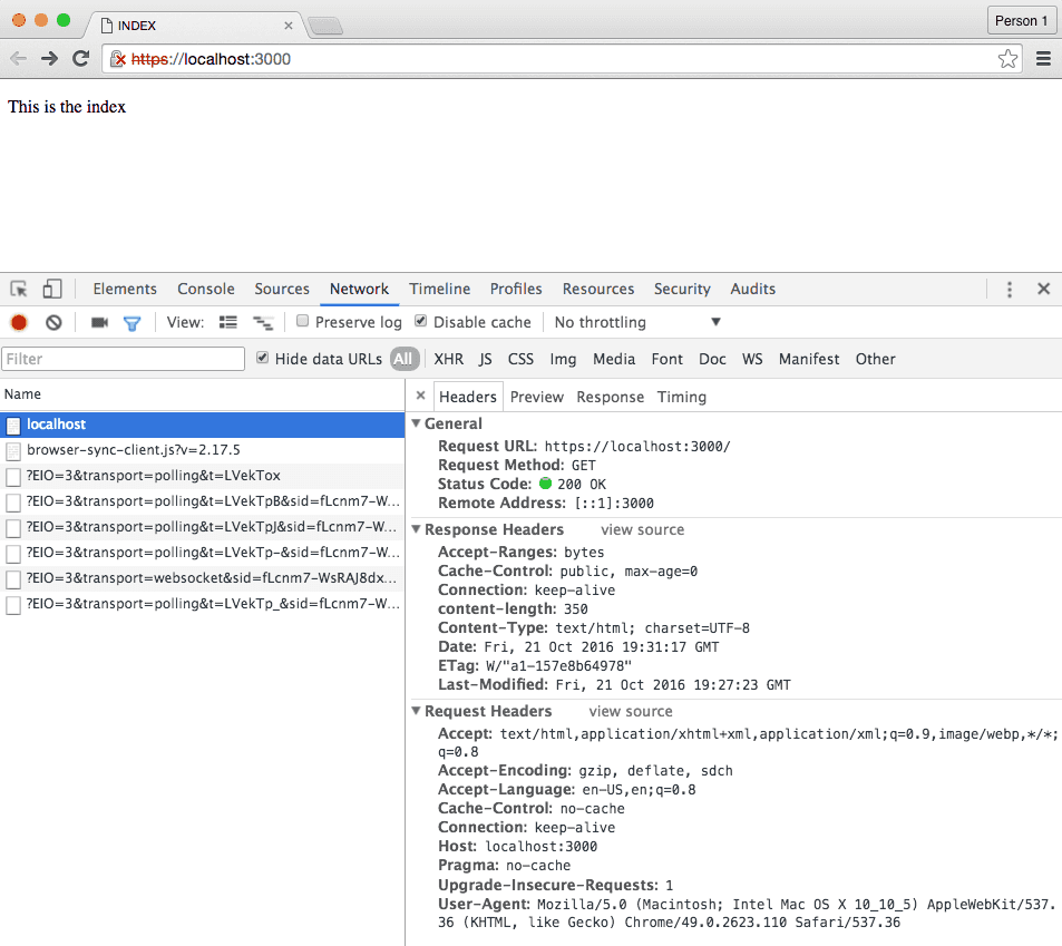 ...For example: to test your application over https, set "https": true right beneath your server options. When browser-sync opens the browser with your entry point, the browser should warn you that the connection isn’t safe: